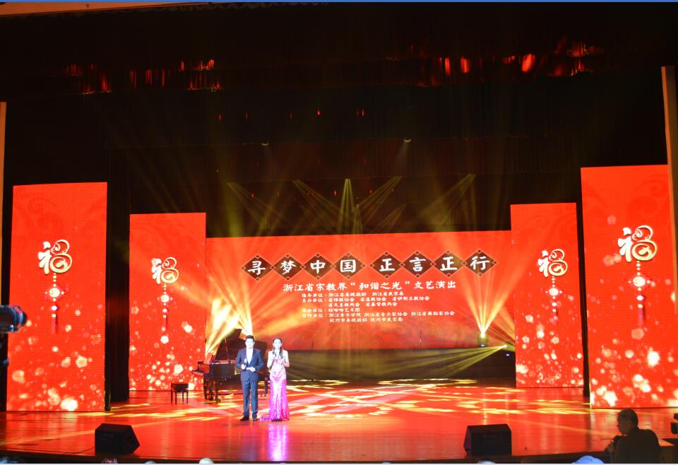 2016年1月13日 ,浙江省宗教界“和谐之光”大型宗教界专场文艺演出在浙江省音乐厅举行,来自五大宗教界人士同台演出,为观众献上一台集音乐、舞蹈、书画、诗歌、武术及茶道、花道、香道等艺术于一体的文化饕餮盛宴。