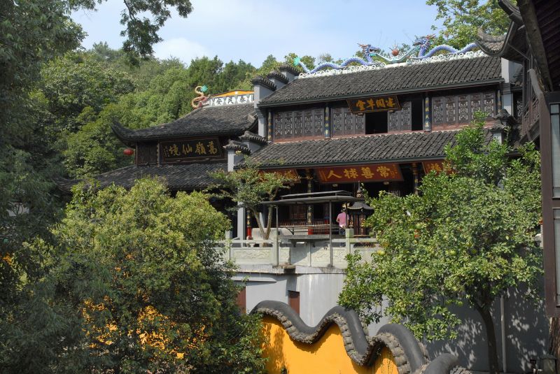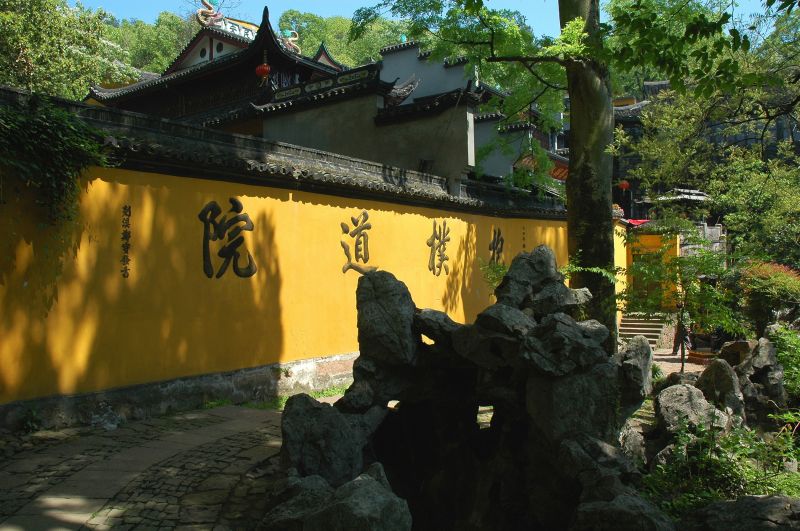 从西湖岸边,来到葛岭脚下,首先看到一座砖石结构的黄色牌楼。经过牌楼,拾级而上,不一会就到了抱朴道院山门。门外院墙随山势起伏,宛若一条游动的黄龙,因此有“龙墙”之称,为抱朴道院的胜景之一。